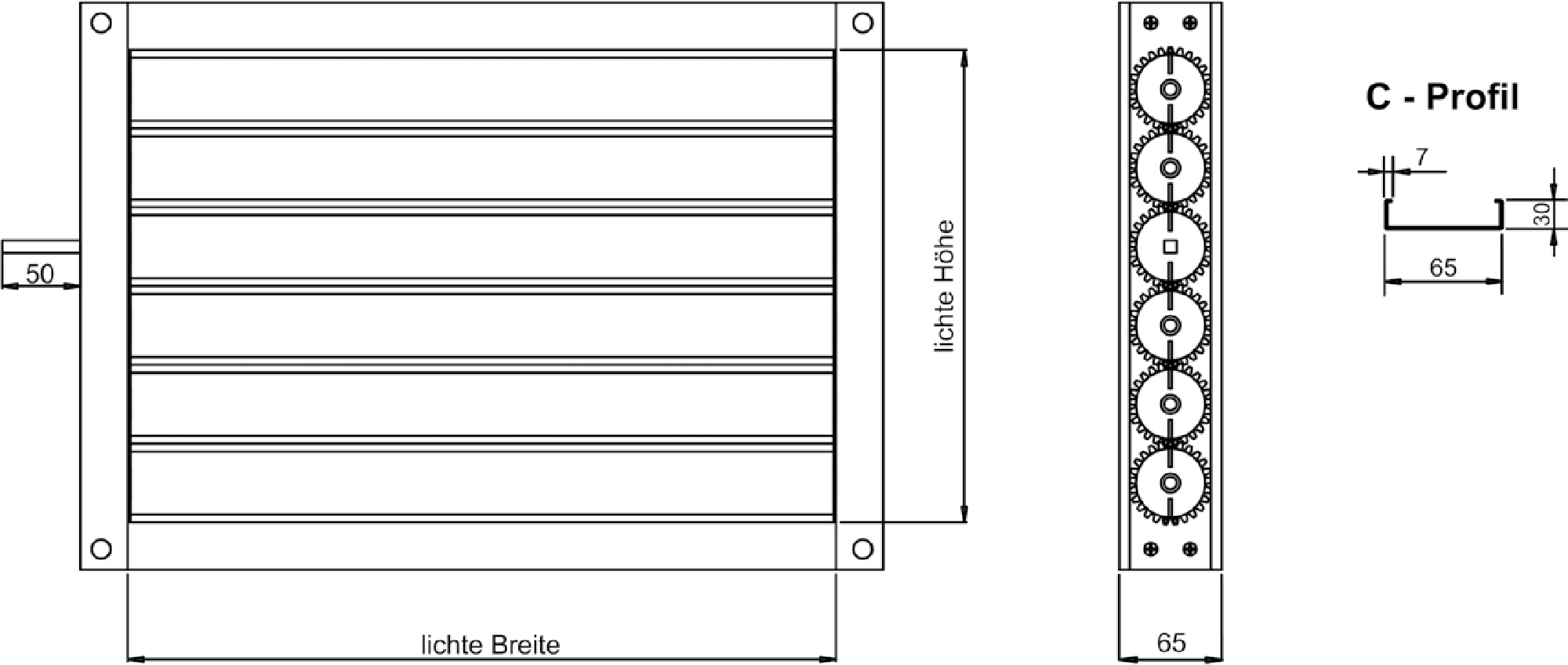 - Kupplung der Lamellen über außenliegende Kunststoffzahnräder, gegenläufig
