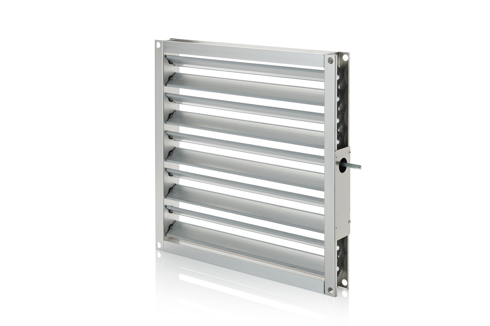 - Jalousieklappe zur Druck und Volumenstromänderung mit gegenläufig gekuppelten Hohlkörperlamellen aus Aluminium mit Gummilippendichtung
