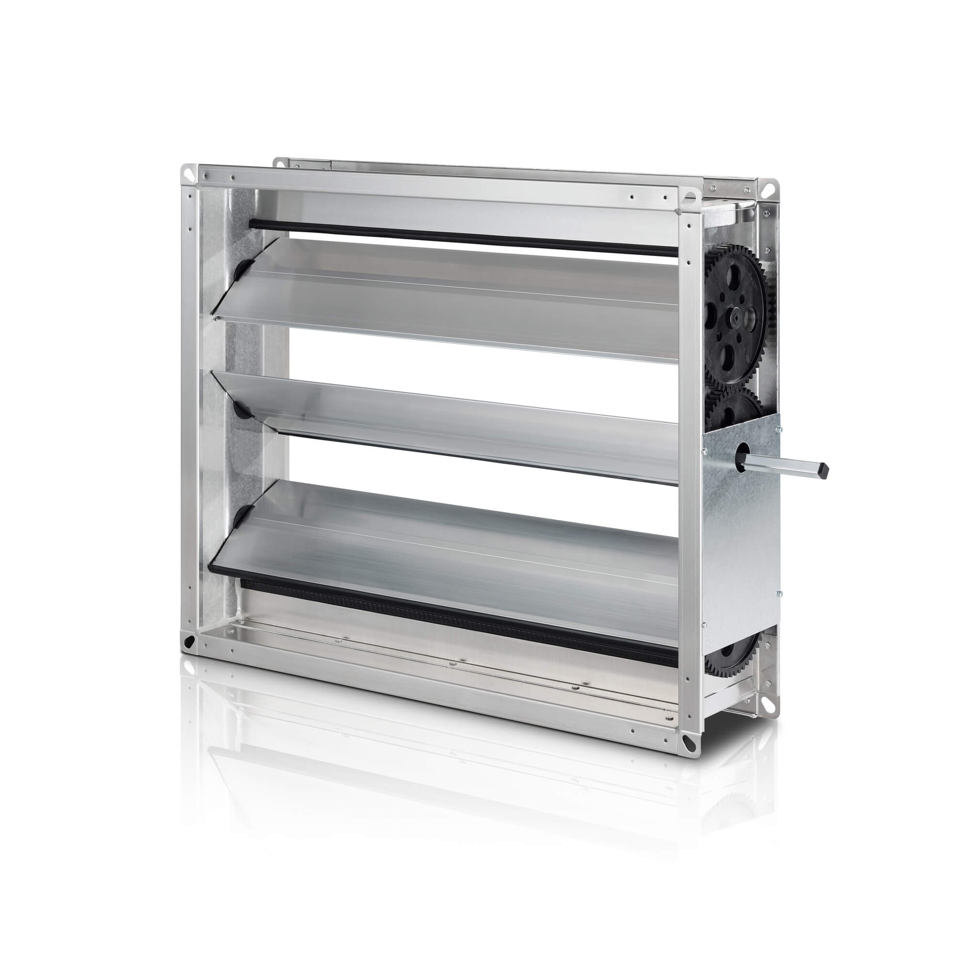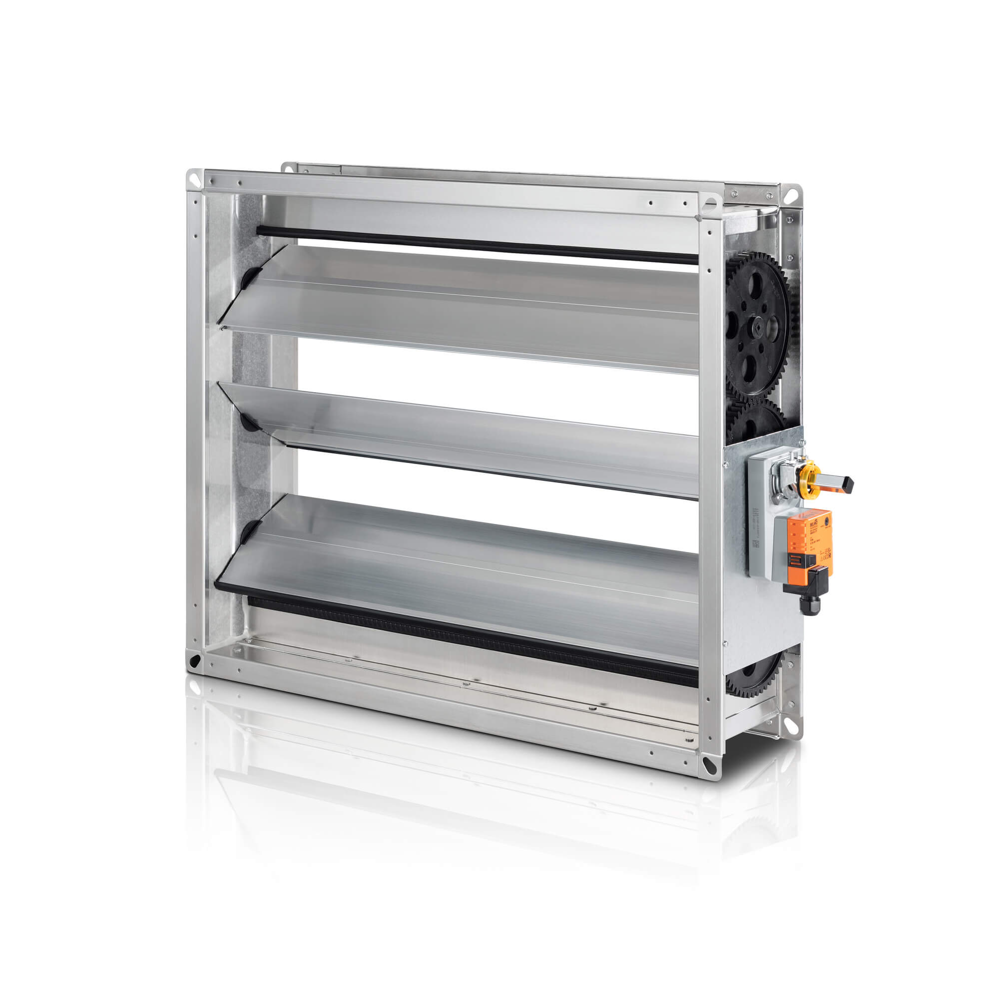 - Jalousieklappe zur Druck- und Volumenstromänderung mit gegenläufig gekuppelten Hohlkörperlamellen aus Aluminiumprofil mit Gummilippendichtung