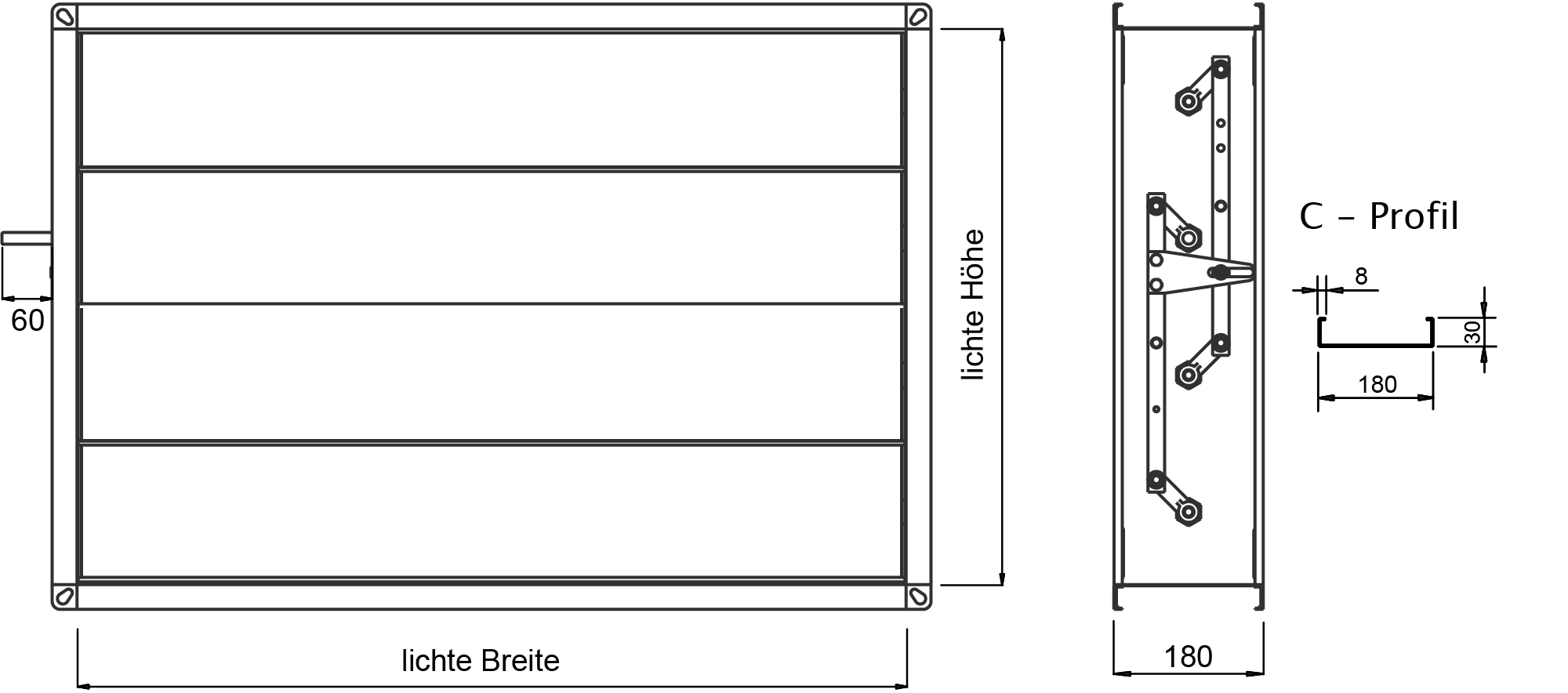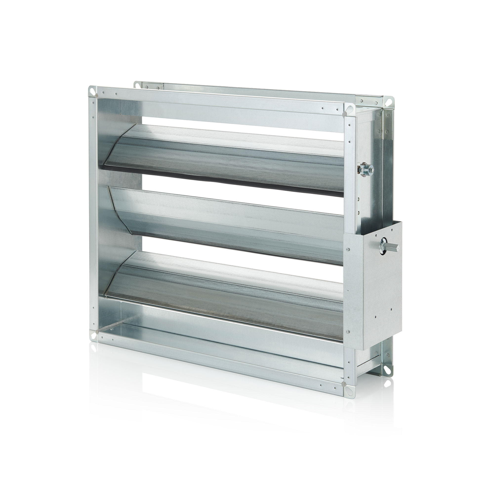- Jalousieklappe zur Druckund Volumenstromänderung mit gegenläufig gekuppelten Hohlkörperlamellen aus verzinktem Stahlblech mit Gummilippendichtung zum Einsatz bis +200°C