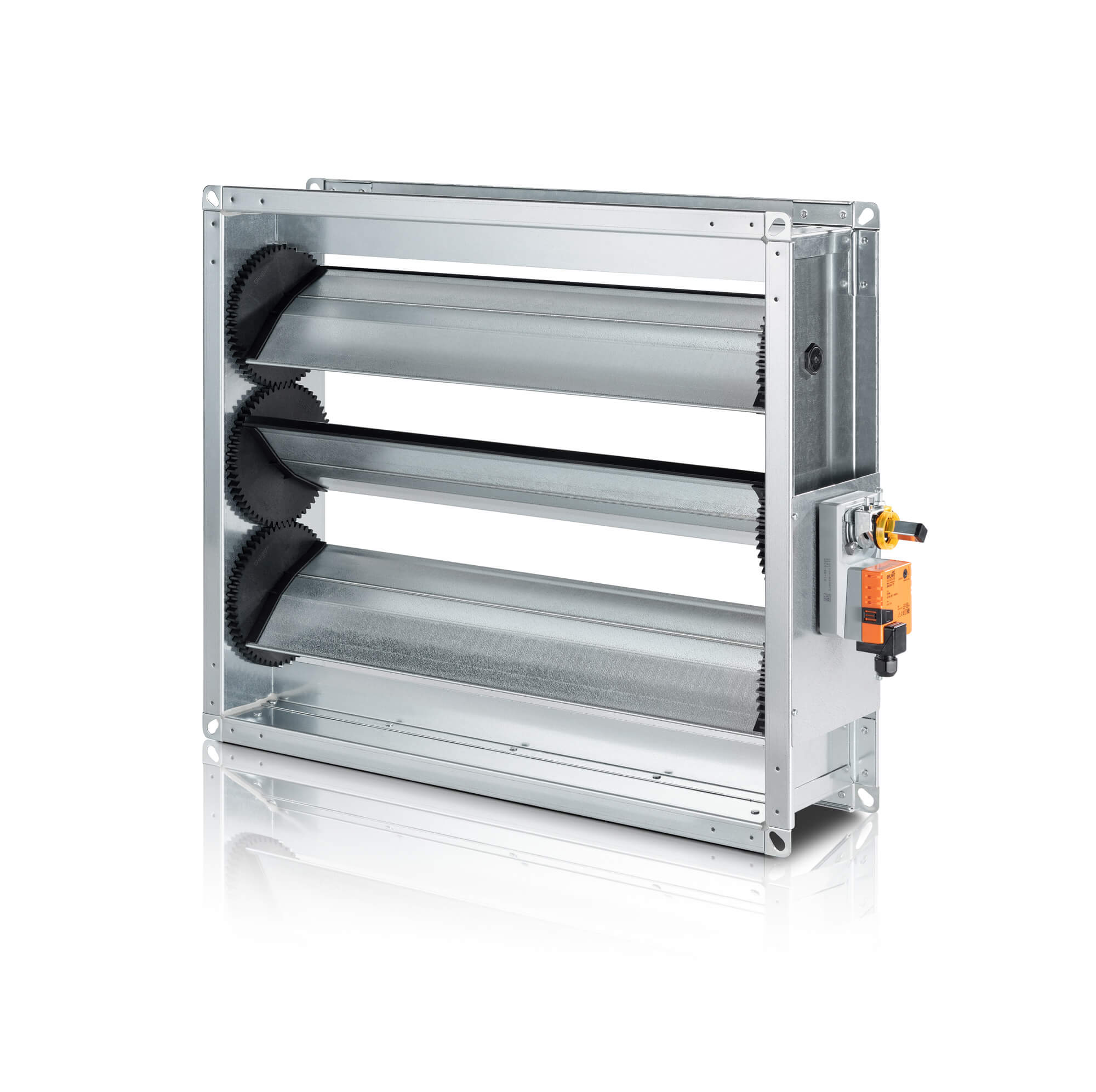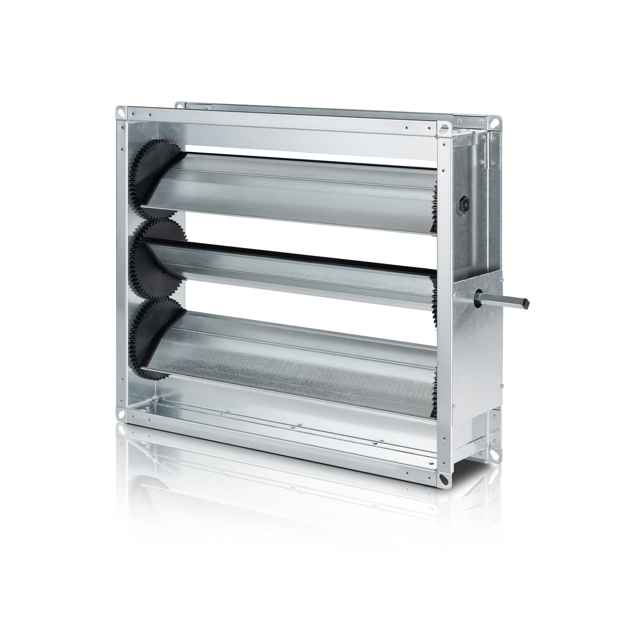 - Jalousieklappe zur Druck und Volumenstromänderung mit gegenläufig gekuppelten Hohlkörperlamellen aus Stahl verzinkt mit Gummilippendichtung