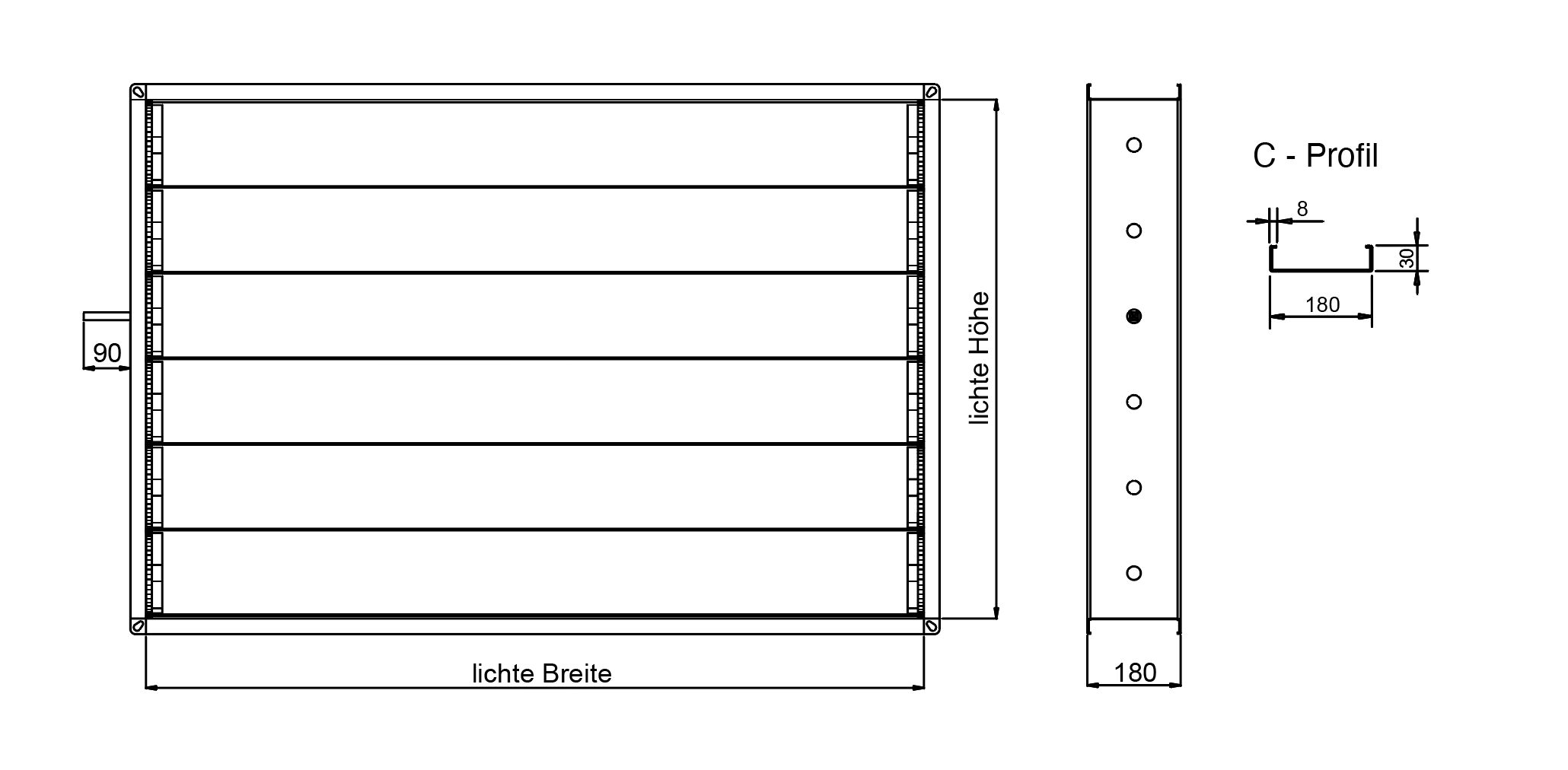 - Rahmen aus Stahlblech verzinkt mit einer Bautiefe von 180 mm; Flansch 30 mm C-Profil mit Eckloch